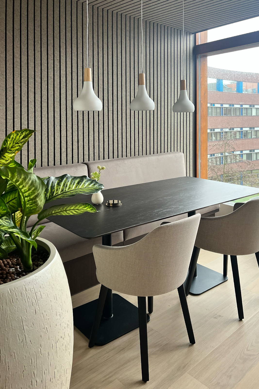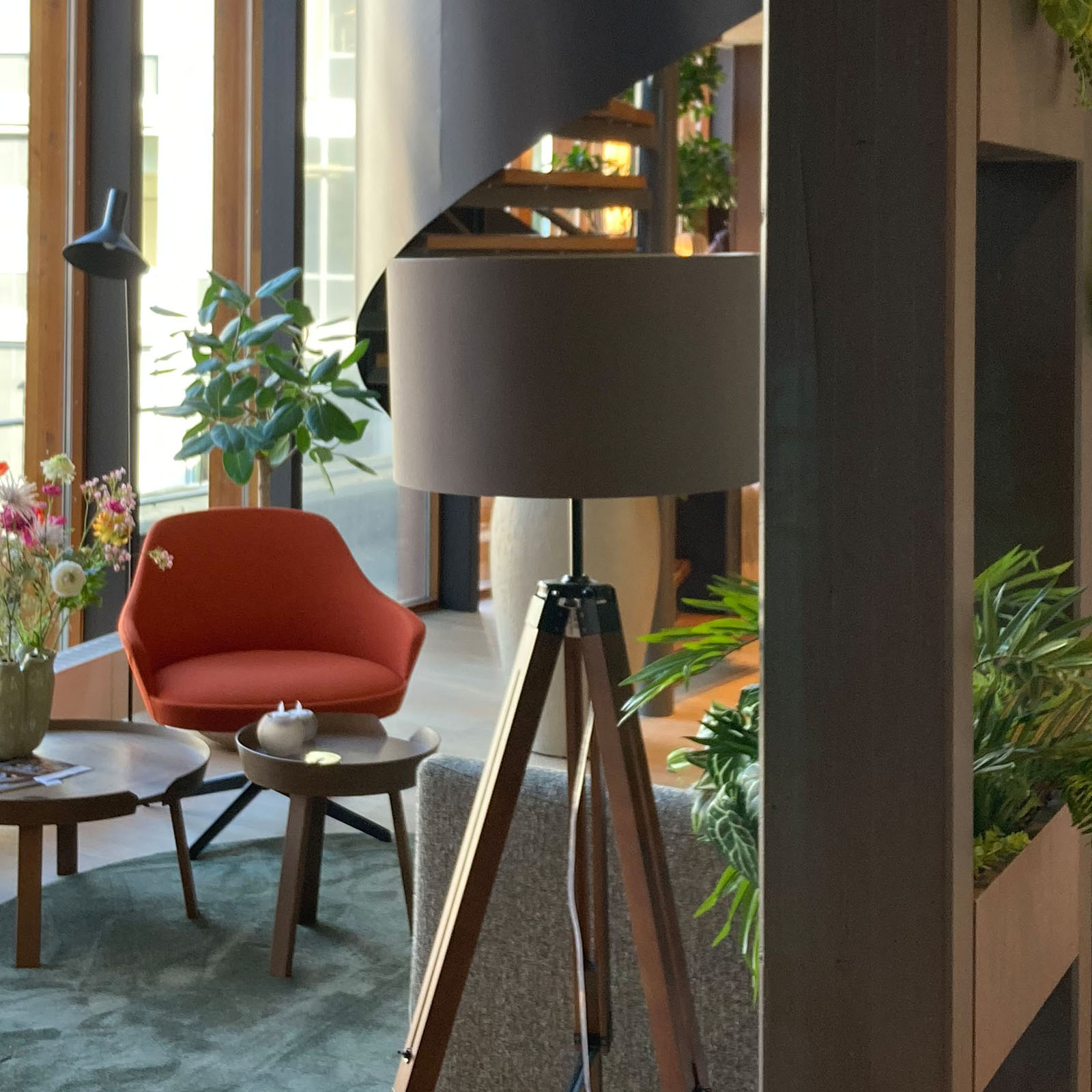 Door maatwerkmeubilair is optimaal gebruik gemaakt van de ruimte en zijn banken, wandkasten en bureau’s fraai geïntegreerd in de ruimten. De akoestiek is verbeterd door gedeeltelijk de plafonds en vloeren te voorzien van isolatie. Tevens is gezocht naar akoestische wandafwerking en vloerkleden en is er heel veel groen toegepast om ook daarmee een positieve bijdrage te leveren aan de geluidsbeleving.